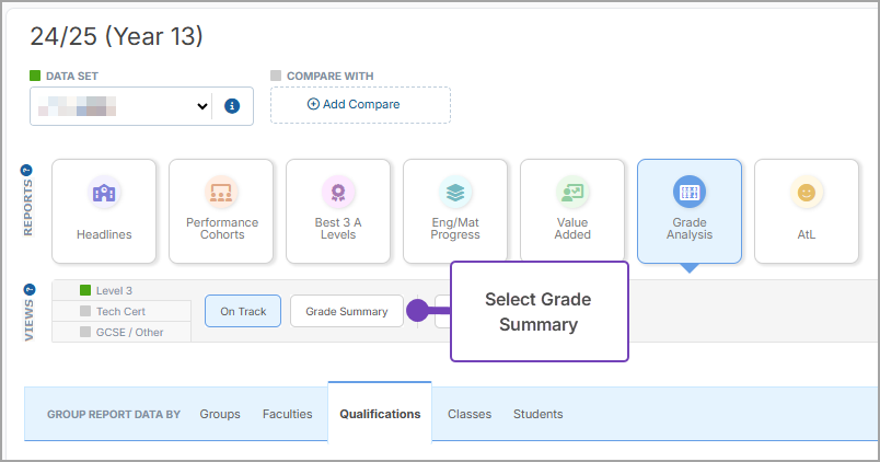 This article explains how to view cumulative grade ranges within the Grade Analysis report - Grade Summary view of the KS5 reports, for example, the number or percentage of A*-B grades, and D*-P grades for each qualification.