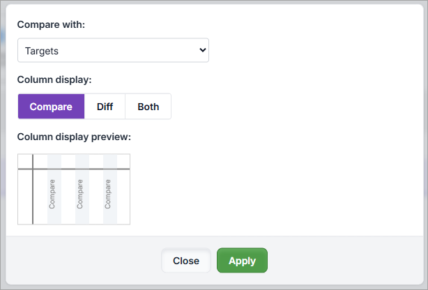 - Select a data set to Compare with the figures you’re currently viewing, for example, Targets: