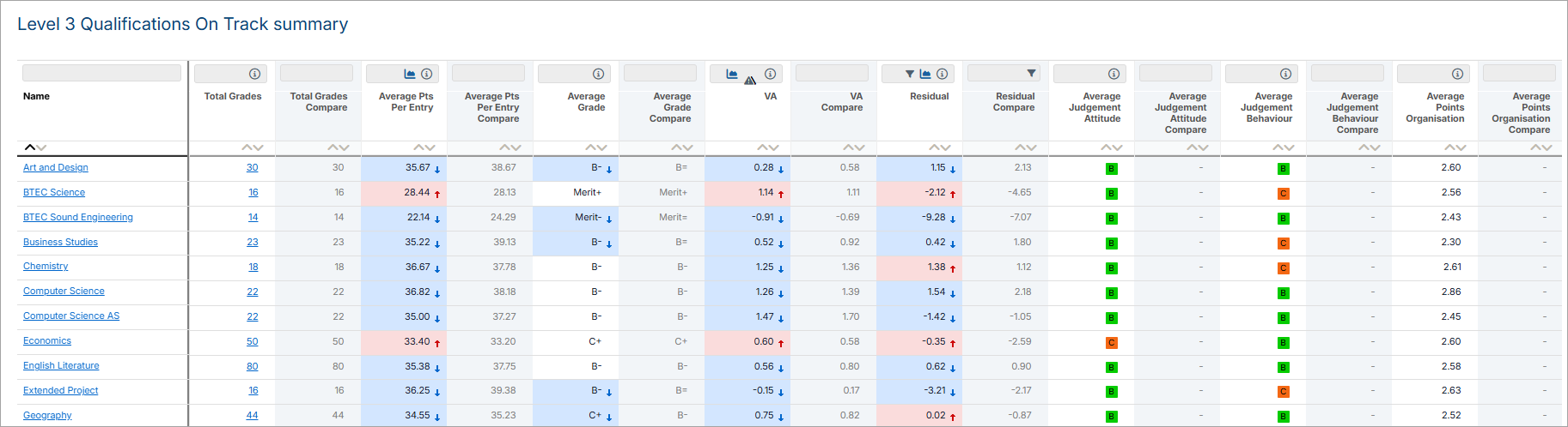 When comparing two data sets, view the Grades Analysis - On Track report to generate extra columns showing the total number or percentages of grades above, equal to, or below the compared data set. These can be viewed by scrolling across: