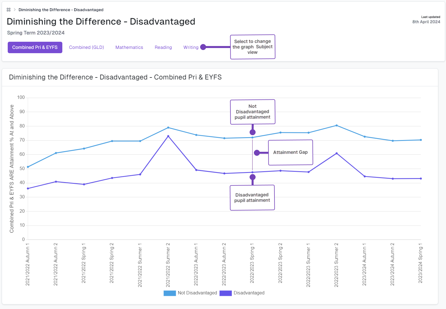 If you want to view the attainment of pupils categorised as both Not Disadvantaged and Disadvantaged pupils and the associated Gap over a longer period of time (including the last two Academic Years), and for individual Subjects (Reading, Writing and Mathematics) as well as the Combined Subjects, you can do this from within the widget's report view.