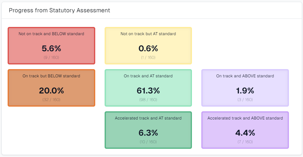 Information:  Only those pupils with assessment data are included. Pupils without assessment data are not included in calculations. For example, in a Trust comprising 1,200 pupils, if 50 pupils do not have assessment data, only the progress of 1,150 pupils will be displayed in the widget. When calculating percentages, the percentages displayed will be based around the 1,150 who have assessment data, and not the total 1200 pupils in the Trust.