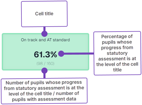 • pupils whose progress is at the level indicated by the cell title shown as a numeric value along with the total number of pupils who have assessment data.
