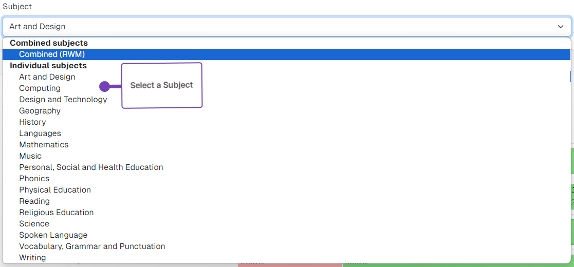 You can choose either a Combined Subject (Combined (RWM) - Combined Reading, Writing and Mathematics) or an individual Subject:
