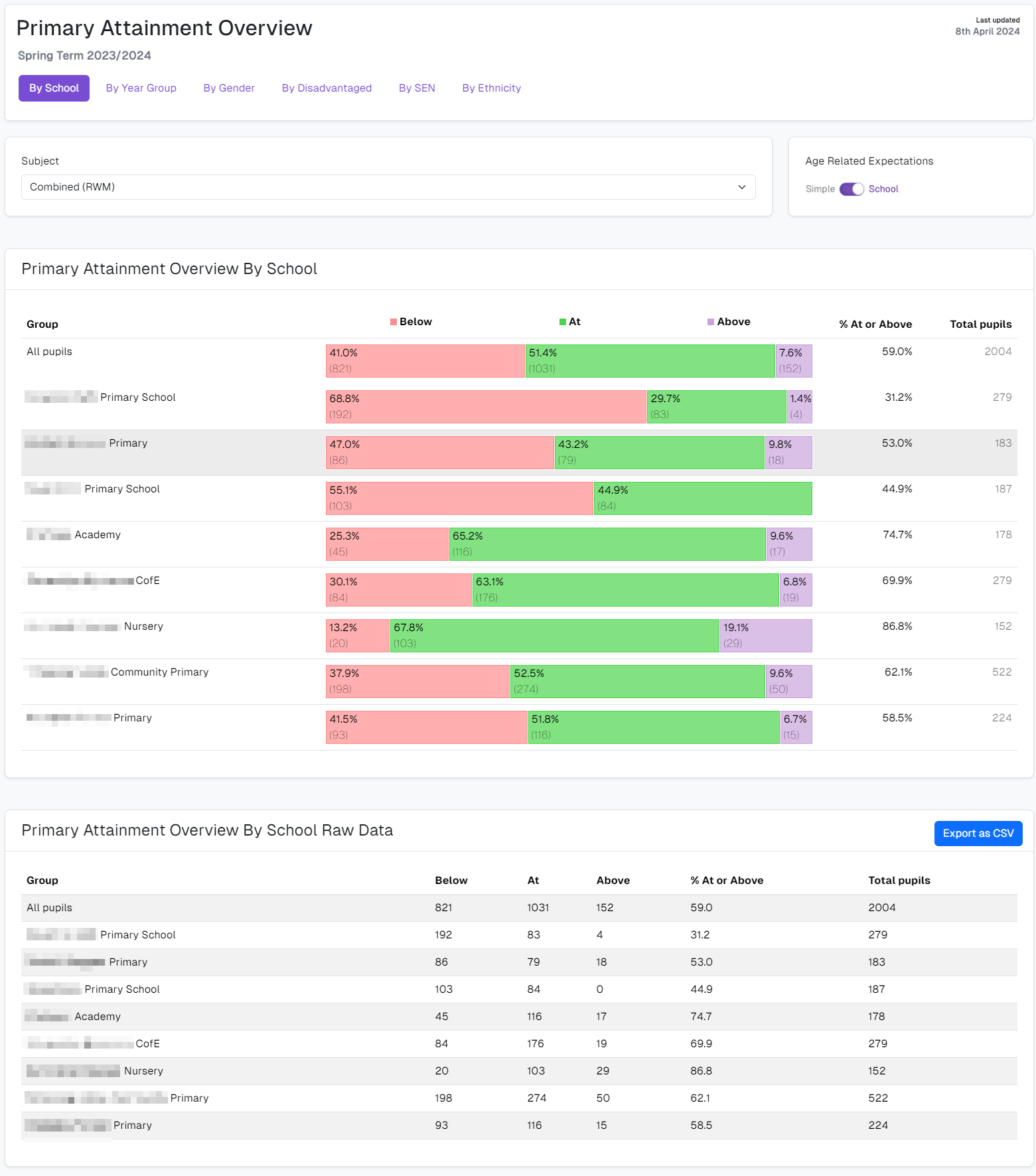 When you load the report, you are presented with a chart and table that details which pupils are achieving Below, At or Above ARE. The default view shows pupil attainment (using a Simple Age Related Expectations view) for the Combined (RWM) Subject By School. You can change the Subject and the Group as needed to analyse individual Subject attainment for different Groups of pupils. The other Groups available for selection are By Year, By Gender, By Disadvantaged, By SEN, and By Ethnicity. If all Schools within your Trust are using the same Summative Assessment model for recording ARE, for example, one that is more detailed than the default Below, At or Above ARE (referred to as Simple) you can choose to use this to display attainment with a greater level of granularity (referred to as School).