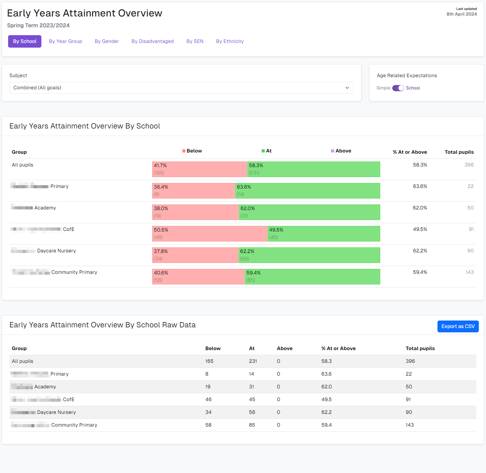 When you load the report, you are presented with a chart and table that details which pupils are achieving Below, At or Above ARE. The default view shows pupil attainment (using a Simple Age Related Expectations view) for the Combined (All Goals) Subject By School. You can change the Subject and the Group as needed to analyse Combined (GLD) or individual Subject attainment for different Groups of pupils. The other Groups available for selection are By Year, By Gender, By Disadvantaged, By SEN, and By Ethnicity. If all schools within your Trust are using the same Summative Assessment model for recording ARE, for example, one that is more detailed than the default Below, At or Above ARE (referred to as Simple) you can choose to use this to display attainment with a greater level of granularity (referred to as School).