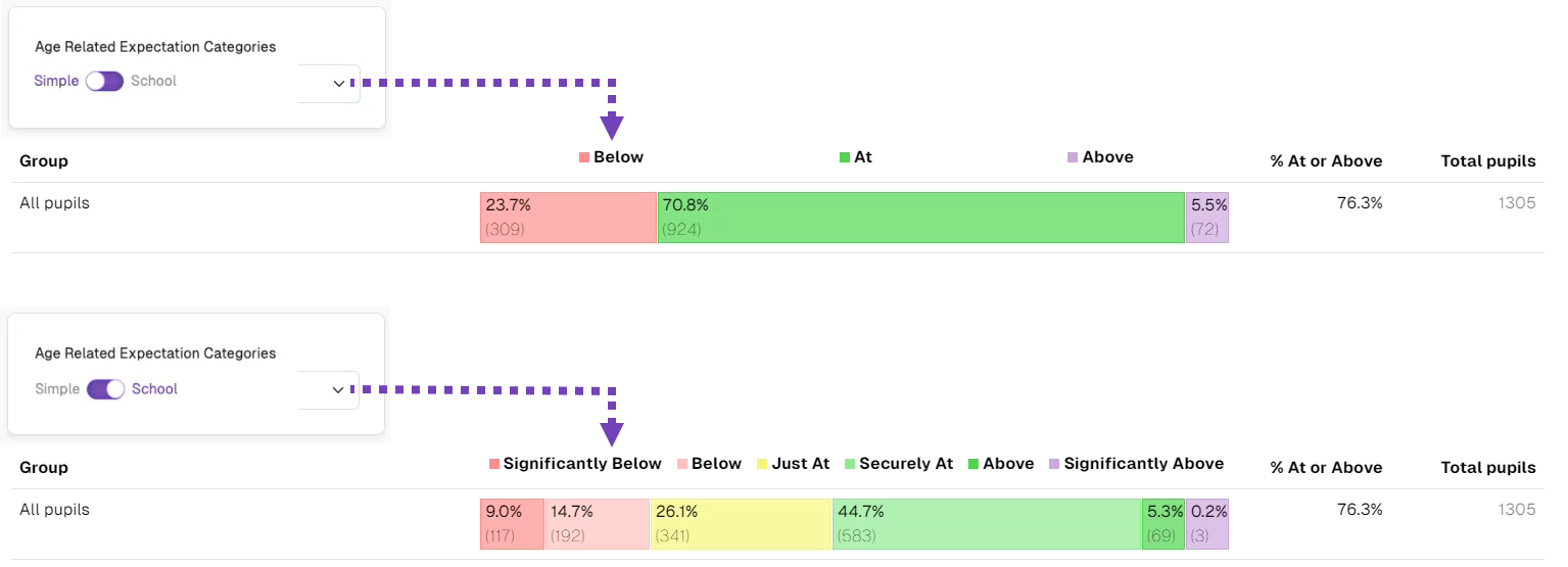 Information:  If all Schools within your Trust are using the same Summative Assessment Model for recording ARE, for example, one that is more detailed than using the default Below, At or Above ARE (referred to as Simple) you can choose to use this to display attainment with a greater level of granularity. Select School in the Age Related Expectations control to do this. If there is any inconsistency in the Summative Assessment Model used across the different schools within your multi-school environment (even if only one school uses different Summative Codes), Simple will be used and you will not be able to select School.