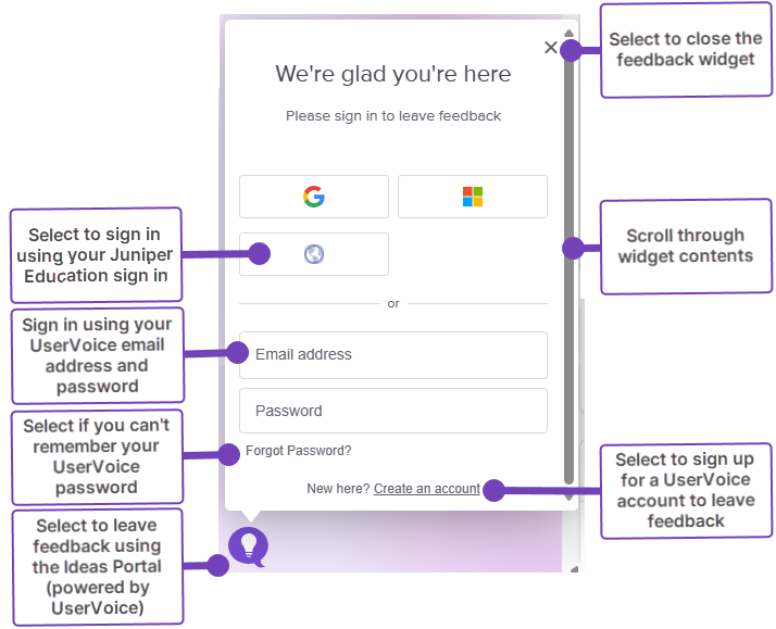 To find out more about how to use Juniper Education's Ideas Portal, including detailed instructions about how to leave feedback using the widget, go to the Ideas Portal section within the Juniper Education Support Website (https://junipereducation.zendesk.com).