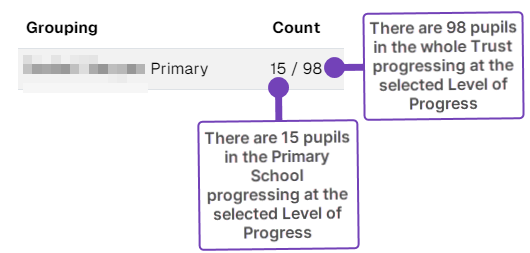 The count shows the number of pupils in the specific Group that the row represents, along with the total number of pupils in the whole Group across the Trust who are performing at the selected Level of Progress Made, for example, if you are looking at a specific School within the School's Group: