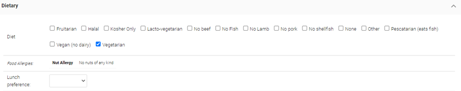 In this sub-section, tick boxes can be selected to record any specific dietary requirements for the pupil, such as whether they are vegetarian or vegan. Additional allergies, recorded via the Medical Conditions and Allergies sub-section, will also appear here once added. Information recorded here can also be displayed in the School Meals section of Pupil Asset or within a Pupil List.
