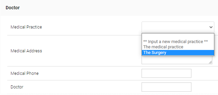 Under this sub-section, you can record details of a pupil’s doctor and/or medical practice. Click on the Medical Practice drop down menu to input details of a new medical practice or select a medical practice that has already been added for other pupils to pre-populate the fields.