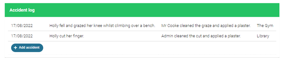 This sub-section allows you to record accidents, as well as showing you a list of any previously recorded accidents a pupil has had.