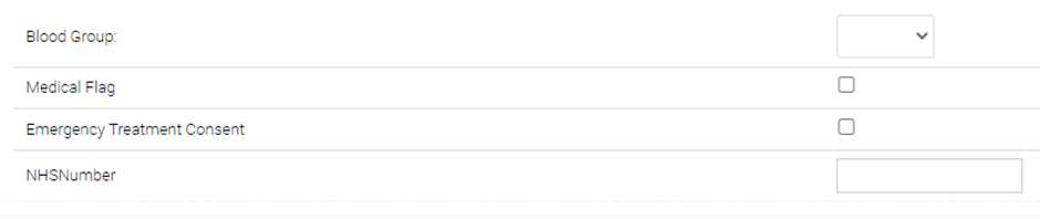 Under this sub-section, you can record basic medical information, such as the pupil’s blood group, their NHS number and whether Emergency Treatment Consent has been given. The medical flag option, once ticked, can be used to filter children within Pupil List and selected to display as an additional column in the Pupil List as well.