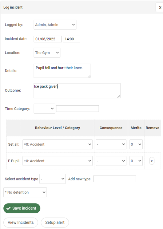 To record an accident, click the blue ‘Add accident’ button and you will be taken to a new page within the Behaviour section of Pupil Asset. From here you can record all relevant information about the accident, including when, where and what happened, as well as the outcome, or any appropriate consequences.