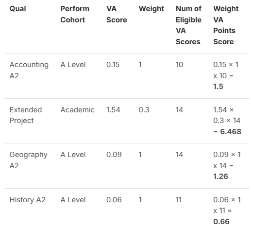 Weighted Value Added Points Score (for one qualification) = Qualification's Value Added Point Score x Weighting x Number of Eligible Value Added Scores