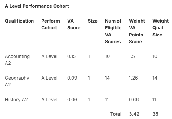 Subjects included (Number of Eligible Value Added Scores) Total Qualification Type Value Added Scores A Level Qualifications Accounting A2 (10), Geography A2 and History A2 10 + 14 + 11 = 35 Academic Qualifications Extended Project 14 The calculations are as follows: