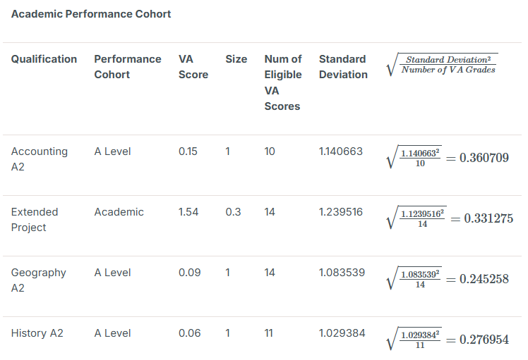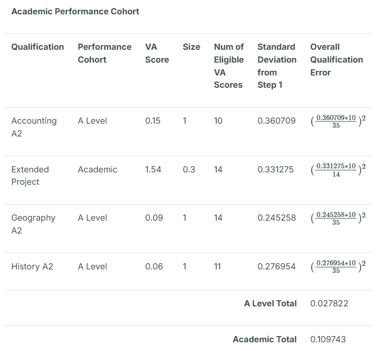 Confidence intervals for individual performance categories (A Level, A Level and Other Academic, or Applied General) are calculated using the Value Added Scores for each individual qualification, the size of all qualifications and the standard deviation provided by the DfE. This is calculated via the following steps: