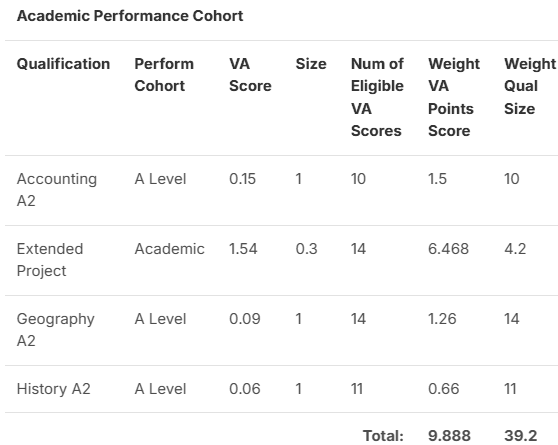 Qualification Performance Cohort VA Score Size Weighted VA Score Accounting A2 A Level 1.61 1 1.61 x 1 = 1.61 BTEC Business (Diploma) Applied General -0.05 1.5 -0.05 x 1.5 = -0.075 Extended Project Academic 0.48 0.3 0.48 x 0.3 = 0.144 Geography A2 A Level 1.29 1 1.29 x 1 = 1.29 History A2 A Level 0.32 1 0.32 x 1 = 0.32 Total 4.8 3.289 Step 2 - Calculate the Student’s Average VA: