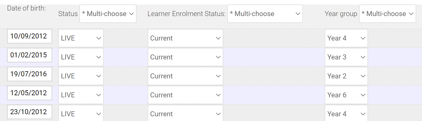 These 'Multi-choose' options will allow the 'flood filling' of changes made to any pupil displayed (displayed pupils are controlled by the filter block). Changes can still be made to individual pupils by editing the field contain on the relevant pupil row.