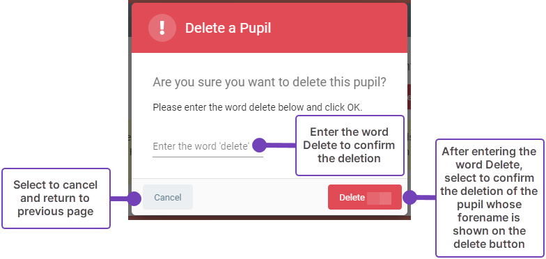 - Confirm the deletion by selecting Delete [Pupil's name]: