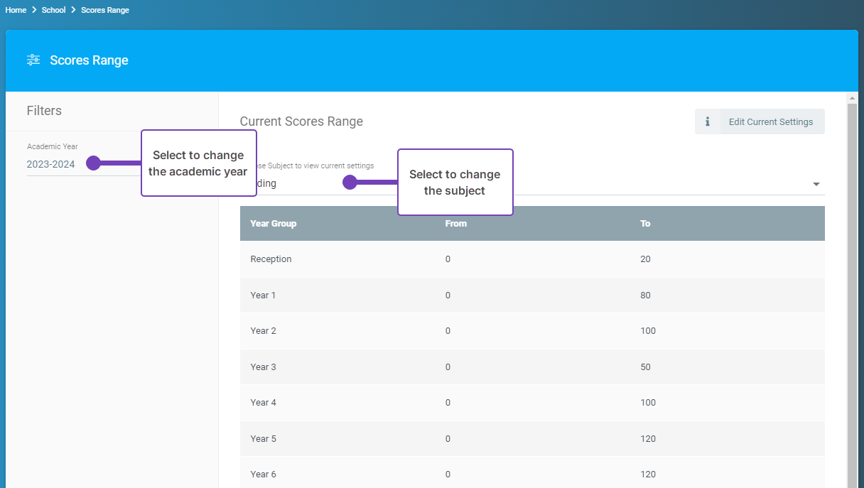This article explains how to edit the Scores Range for tests within your school for individual subjects and years. They are linked to Scores - ARE used to set the expected age-related test scores.