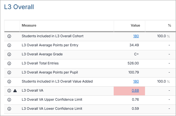 The L3 Overall category, while not officially reported on, lets you view figures such as Average Points per Entry and Pupil, Average Grade, Total Entries and Value Added based on all eligible qualifications.