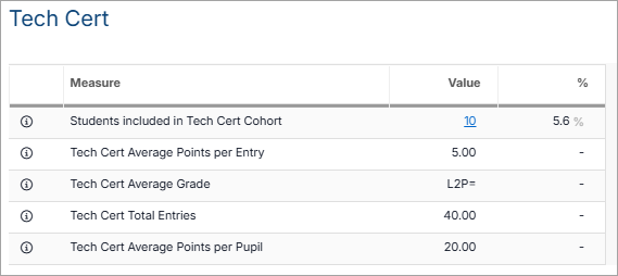 If your students take L2 Technical Certificate qualifications, you can view Average Points per Entry, Average Grade, Total Entries, and Average Points per Pupil for those students in this section.