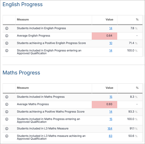 The English Progress and Maths Progress sections show those students included in the Level 2 Progress measures and their scores.