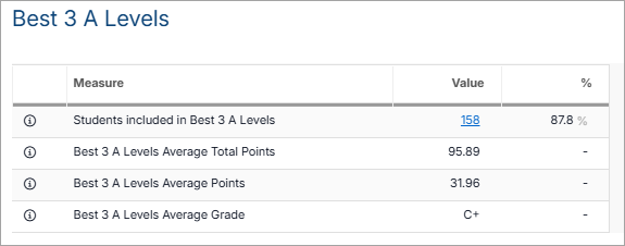 The Best 3 A Levels category lets you view figures related to the 3 A Levels measure, including students included in the measure, Total Points, Average Points, and Average Grade.