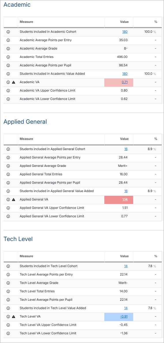 These three categories are similar to those categories mentioned earlier, allowing you to analyse data such as Average Points per Entry and Pupil, Average Grade, and Value Added for each of the three categories