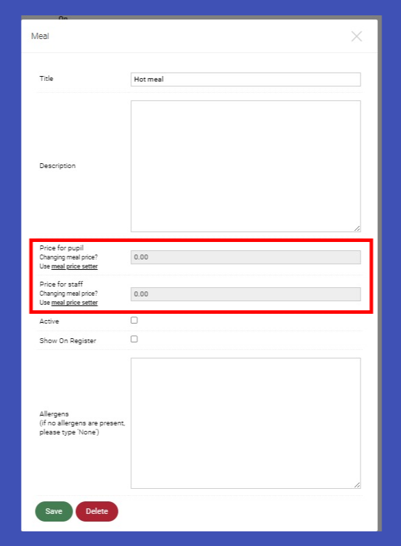 N.B. When entering a 'Price change date' the system will only accept either today's date or a date in the past. Whilst the calendar picker will display dates in the future, the system will not recognise these and the price change will be applied to your meal(s) there and then.