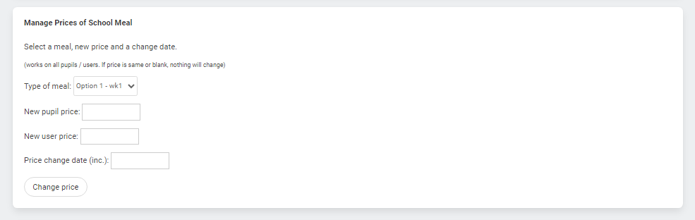 Scroll down the page until you reach the section 'Manage prices of school Meal'. You can now enter your new prices changes.