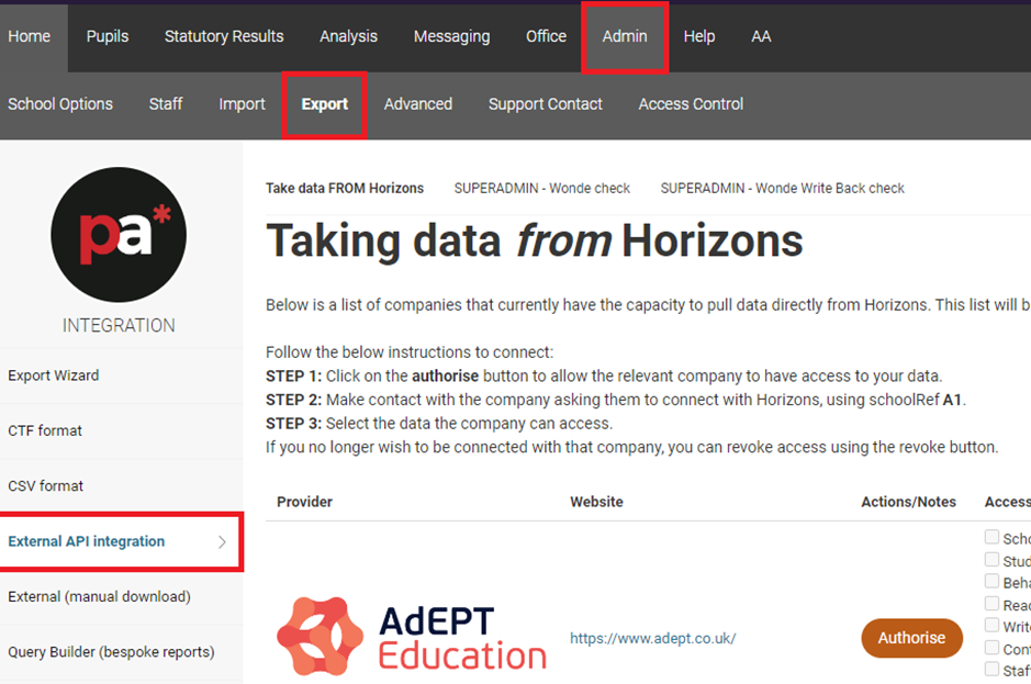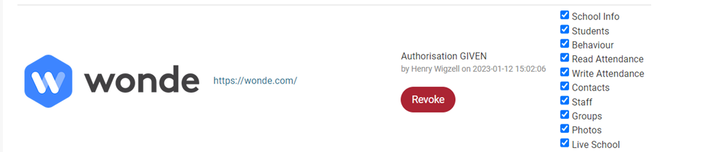 Scroll down to Wonde, click Authorise and select the data types you want to export
