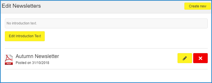 You will then be taken to the edit Newsletter screen, where you will see a list of your existing Newsletters. Next to each of these will be a yellow edit pencil button and a red ‘x’ button.