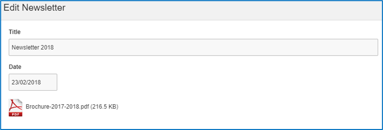 Clicking the yellow edit pencil button will take you to the edit Newsletter screen where you will have the option to change the title given and the date the Newsletter was posted. Once done click the blue ‘save’ button. This will then update the entry on the Newsletter page.