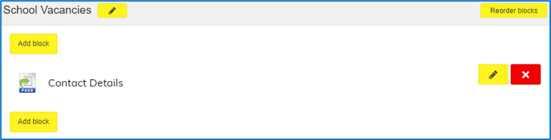 Once you have clicked the ‘edit this page’ button, you will be taken to the editing area for your page. You will now need to select the yellow ‘add block’ button.