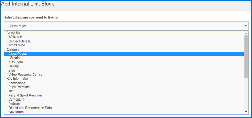 You will now see the below screen, where you have the option to pick the page that you wish to link to from the drop down.