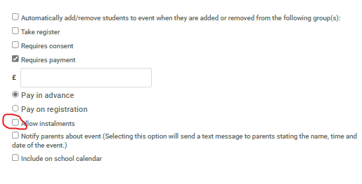 Instalment events allow parents the option to pay in chunks instead of the whole sum at once. The setup of these events are very similar to the standard events but will need the following box ticked under the event setup.