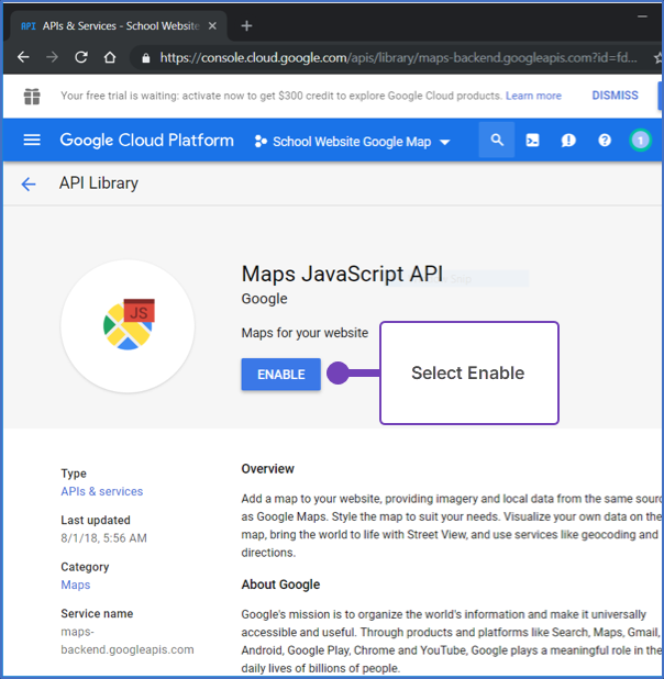- From the Maps JavaScript API Library page, select Enable to activate: