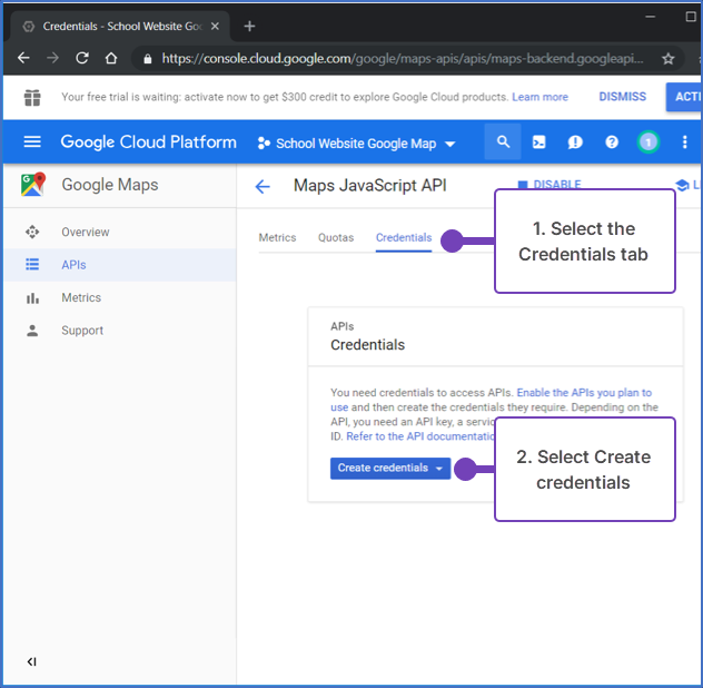 - From the Maps JavaScript API page, select Credentials, then Create credentials: