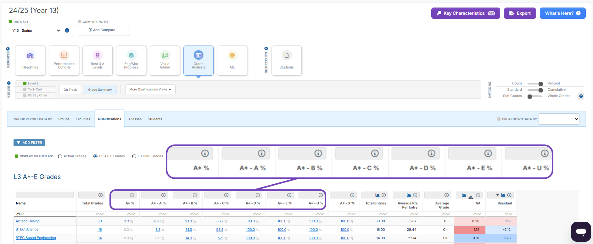 For example, you can group Level 3 grades by actual grades uploaded, or the DfE equivalent A*-E or DMP grades. Tech Certs can be grouped by the actual grades or L2 Tech Cert grades, whereas GCSE/Other grades can be grouped by the actual grades or challenge points bands.