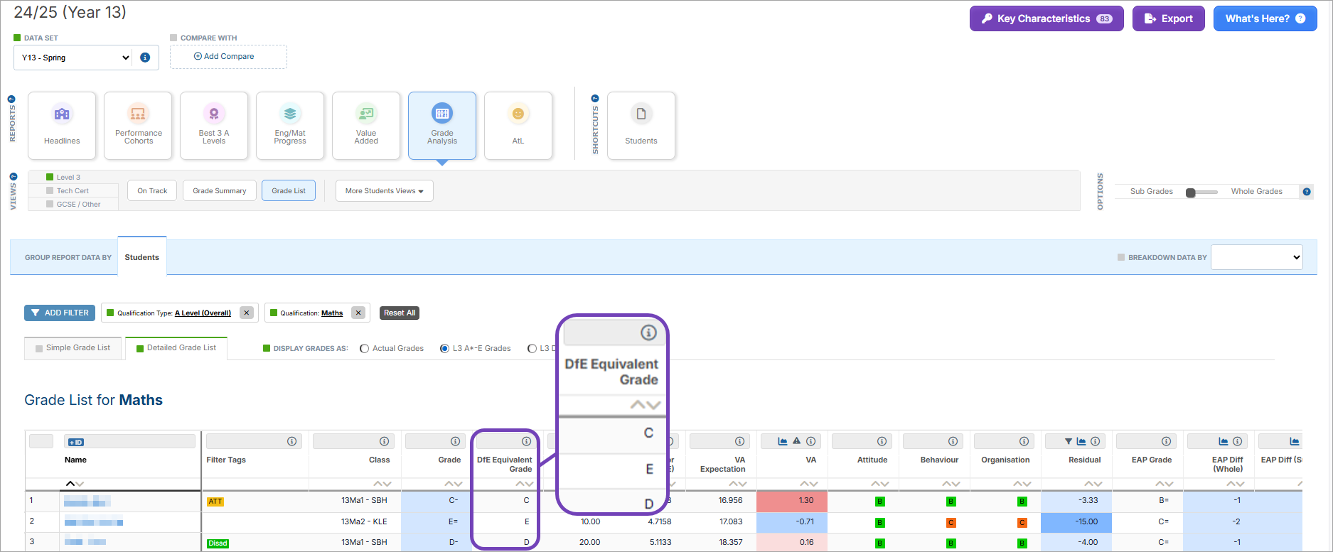 Select an equivalent grade format on the Grade List view to add a column to the report including each student’s DfE equivalent grade (B2). For example, for the Level 3 performance level, this displays each student’s equivalent A*-E or DMP grades, based on your selection. For Tech Certs this displays each student’s equivalent L2 Tech Cert grade, and for GCSE/Other, their challenge points band.