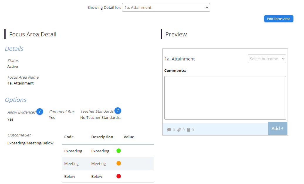 To edit the description or teacher standards, or add/edit outcome set criteria within a focus area, click into the focus area name, then click ‘Edit Focus Area’.