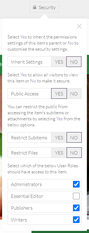 Select No to implement new security settings that differ from the parent page. This will show all available security options for this page/item: