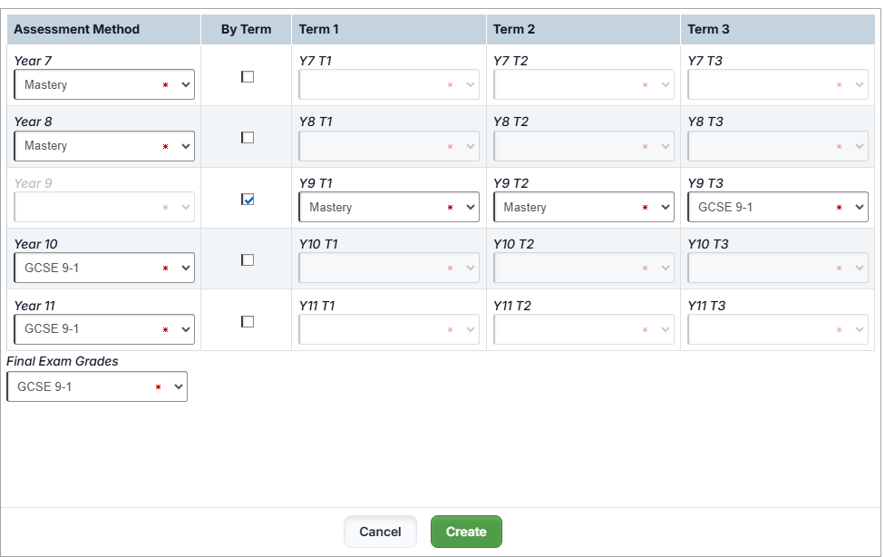 If you plan to use a different Grade Method part-way through the year, check By Term and select the appropriate Grade Method for each term, as shown in the example below, where grades collected in Y7, Y8 & Y9 Terms 1 & 2 will be based on a Mastery method, and in Y9 Term 3 onwards will be collected using the GCSE 9-1 method: