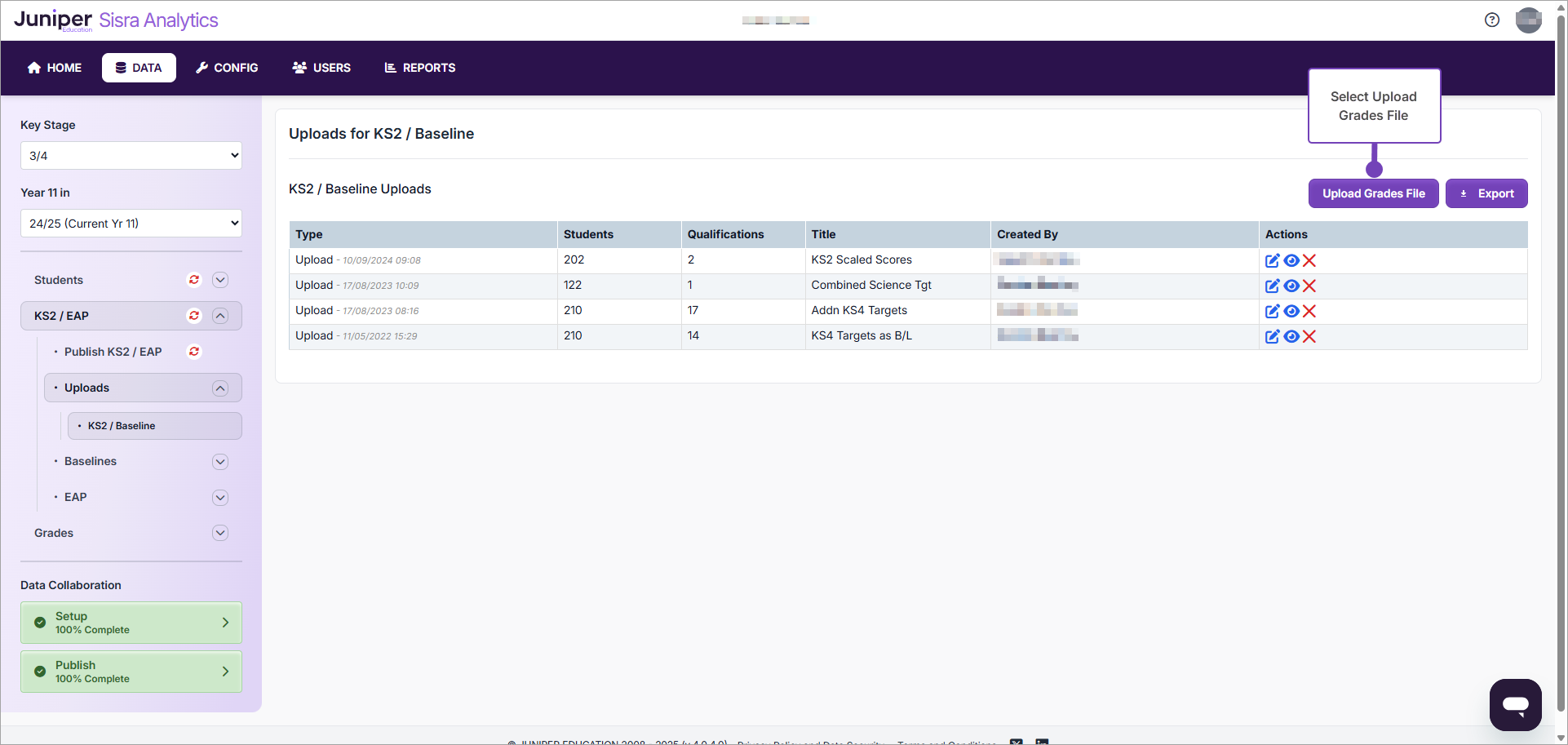 - Select Upload. For further information, see Sisra Analytics: KS3/4 - Preparing and uploading EAP Baselines (Admin).