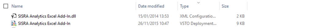 To rerun the installation, navigate to your local program files, for example, C:\Program Files (x86)\SISRA Analytics Excel Add In, and rerun the file called SISRA Analytics Excel Add-In with the type VSTO Deployment. After reinstalling it, reopen the COM Add-In list in Excel to check if it appears.