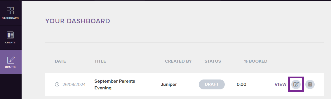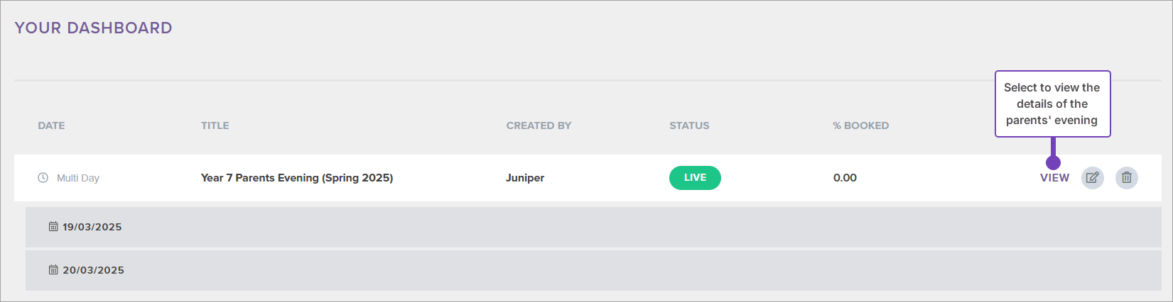 - Select View next to the relevant live parent evening from the Dashboard:
