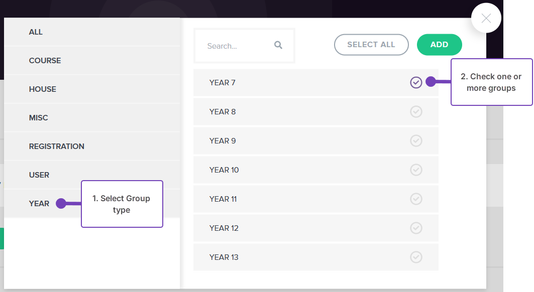- Select + ADD to choose the registration/year group(s)/other groups to include for the parents evening: