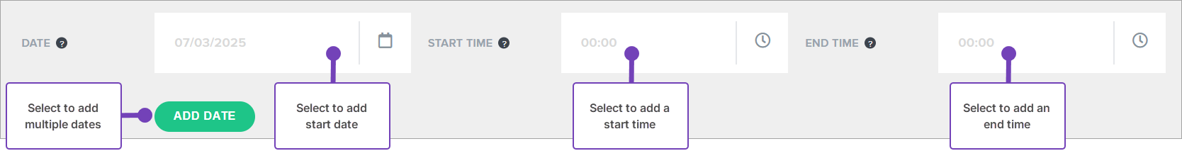 - Select the Date of the event, its Start time and End time. For events over multiple days, select Add Date to add additional dates and times: