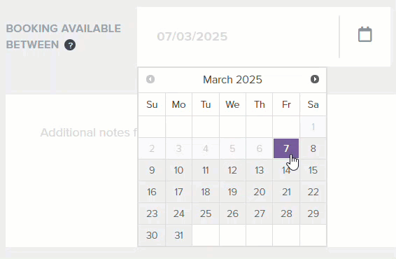 - Set Booking Available Between to set the booking window within which parents can make a booking for the parents evening.If this is over multiple months, select the start date, then select the right button to navigate months, then select the end date in a future month (see animation below):